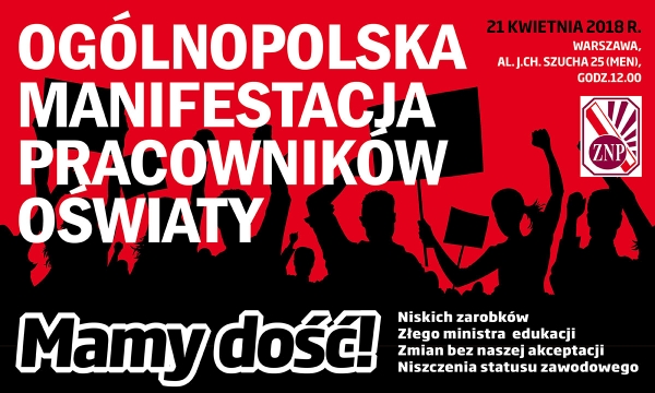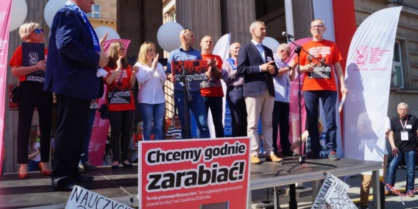 22 września miała miejsce w Warszawie manifestacja ZNP wraz z OPZZ. Nasz związek reprezentowało ok. 12 000 pracowników placówek oświatowych. Z Oddziału Powiatowego ZNP w Świdniku w manifestacji wzięło udział 26 koleżanek i kolegów. Główne żądania ZNP to podwyżka płacy o 1000 zł. oraz przywrócenie sposobu oceniania nauczycieli sprzed zmiany ostatnich przepisów. Manifestanci wyruszyli z Placu Trzech Krzyży aby przejść pod siedzibę Rady Ministrów. Niestety pomimo wcześniejszego zaproszenia, Premier Mateusz Morawiecki nie wyszedł aby wysłuchać tego co chcieliśmy mu przekazać. W imieniu Zarządu Oddziału ZNP w Świdniku dziękuję wszystkim koleżankom i kolegom z naszego oddziału, którzy wzięli w tej bardzo ważnej dla funkcjonowania oświaty manifestacji. Prezes Oddziału ZNP w Świdniku Ewa Kiernicka. Zdjęcia zobacz w galerii.
