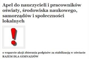Związek Nauczycielstwa Polskiego, w trosce o wysoką jakość kształcenia i wychowania, mając na uwadze dobro dziecka i ucznia, przewidując ogromne koszty społeczne i finansowe, wynikające z zapowiadanej reformy, rozpoczyna akcję zbierania podpisów pod petycją w obronie polskiej szkoły.