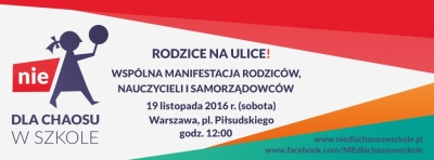 Do udziału w manifestacji ZAPRASZAMY WSZYSTKICH, którzy zgadzają się z naszymi postulatami „NIE dla chaosu w szkole”!