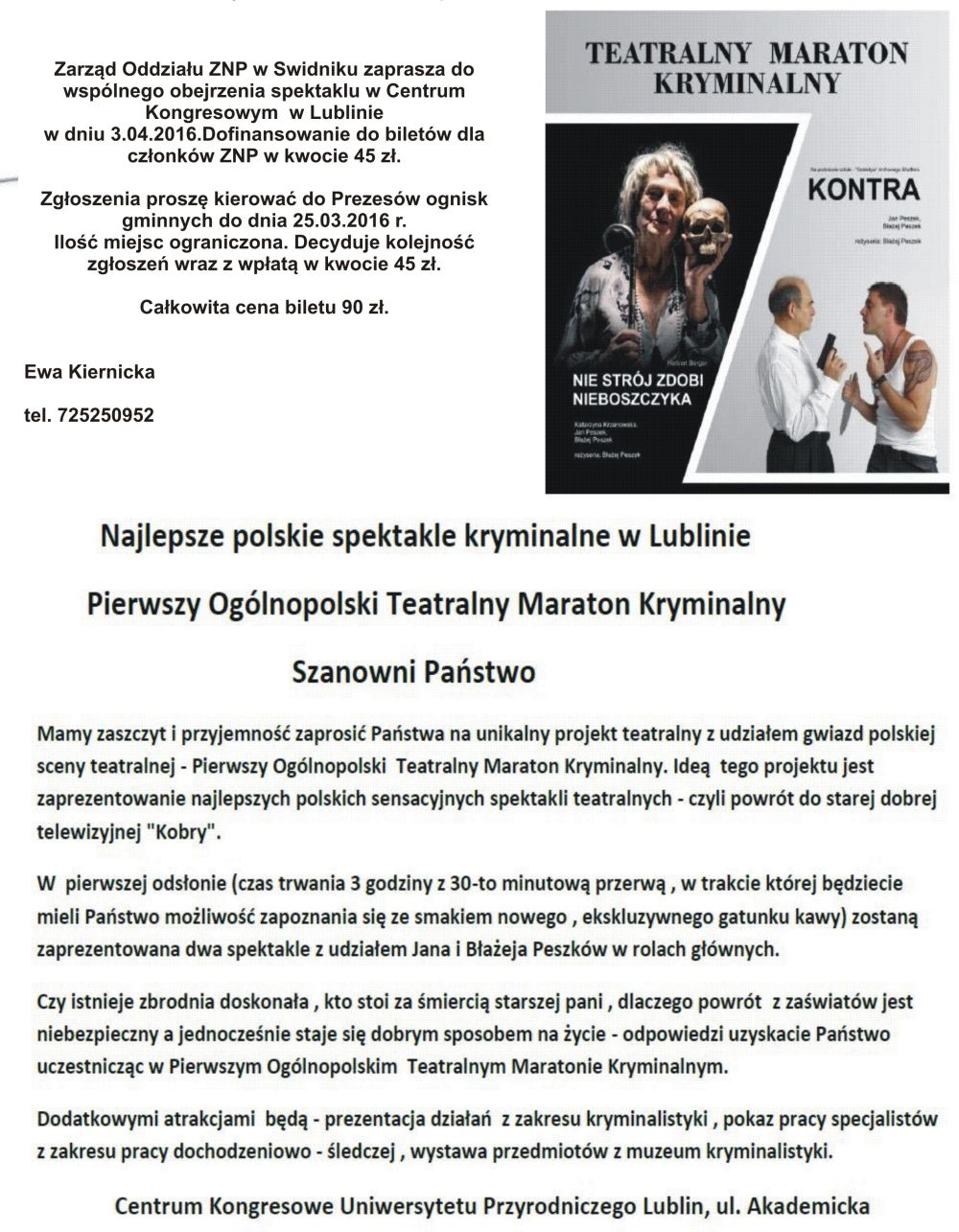 Zarząd Oddziału ZNP w Swidniku zaprasza do wspólnego obejrzenia spektaklu w Centrum Kongresowym w Lublinie w dniu 3.04.2016. Dofinansowanie do biletów dla członków ZNP w kwocie 45 zł.